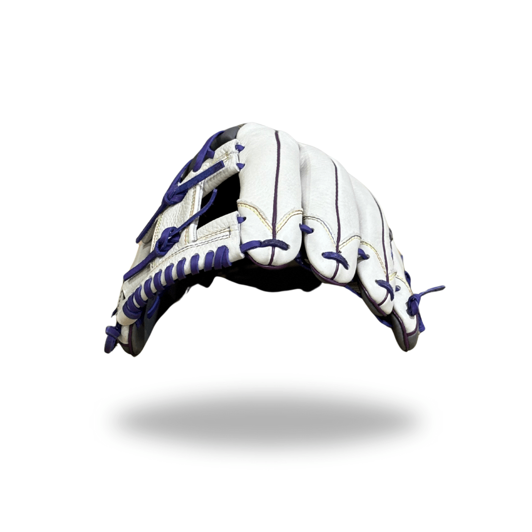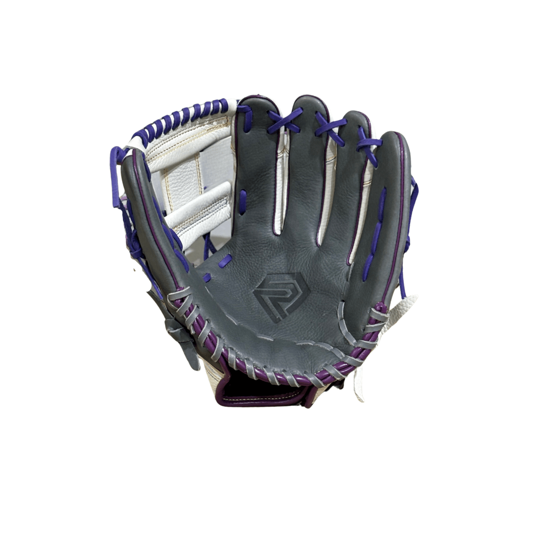 This softball glove is part of the Discovery Series and is a great option for younger players due to its soft flexible feel. It is truly a plug-and-play design. The outer shell is white with grey accents on the pinky, thumb and palm areas. This glove features a vibrant rainbow colored stitching and purple laces; it is hand crafted using Rosie's Premium Steerhide Select leather, which provides long lasting durability for those who desire an "Endless Summer."