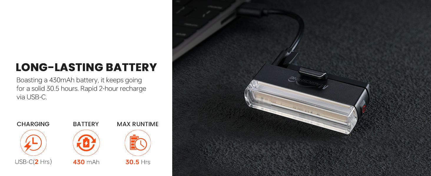 • USB-C Long-Lasting Battery: The smart bike tail light equipped with 430mAh battery, bike tail light rechargeable, keeps going for a solid 30.5 hours. A lock feature to stop accidental turns-on, saving your battery long lasting time. Memory function mode, easy-to-read battery indicator, 5 light modes and USB-C rechargeable to use friendly
