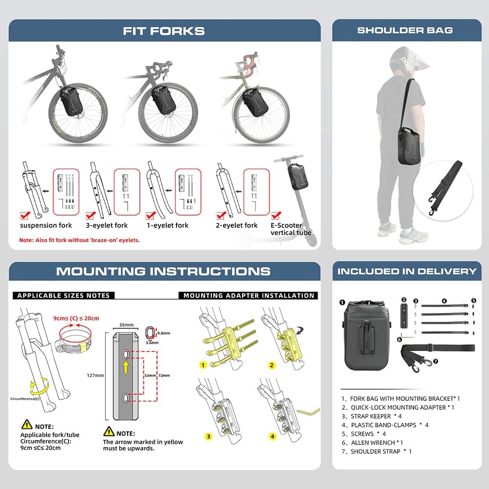 • EASY TO INSTALL:This fork bag use the Quick-Lock System(mounting bracket and adapter) to attach the bag to the fork or tube. And with the quick release function you can simply move the release lever and pull the bag upwards allowing for quick disassembly and use.