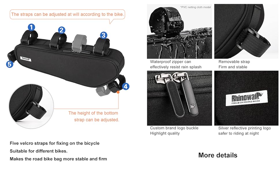 • 【Removable strap】There are five adjustable velcro straps of mountain bike frame bag for fixing on the bicycle, suitable for different bikes, and more stable and firm. The height of the bottom strap can also be adjusted.The inner zipper compartment and two insert pockets can be reasonably classify storage.